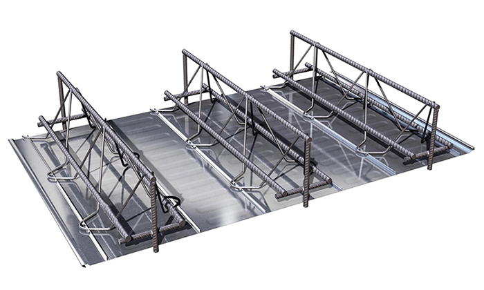 雖然樓承板的優勢大于缺點,但是在不斷前進的路上人們設計出了,鋼筋桁架樓承板解決了第一代與第二代鋼鋼承板存在的諸多缺點,比如建筑物凈高較小等,工程師開發出第三代鋼筋桁架鋼承板,第三代樓承板是通過改變縮小原始樓承板凸高壓型,將樓板中的鋼筋在工廠采用半自動鈑金焊接設備加工成鋼筋桁架,來替代樓承板的凸高和承載力。焊后并采用硅烷化、純錳磷化、水洗、烘干、鍍鋅等除銹防銹環保工藝技術,將鋼筋桁架與樓承板在工廠用高頻阻焊連成一體的組合模板。該模板系統是將混凝土樓板中的鋼筋與施工模板組合為一體,組成一個在施工階段能夠承受濕混凝土自重及施工荷載的承重構件,并且該構件在施工階段可作為鋼梁的側向支撐使用。在使用階段,鋼筋桁架與混凝土共同工作,承受使用荷載。